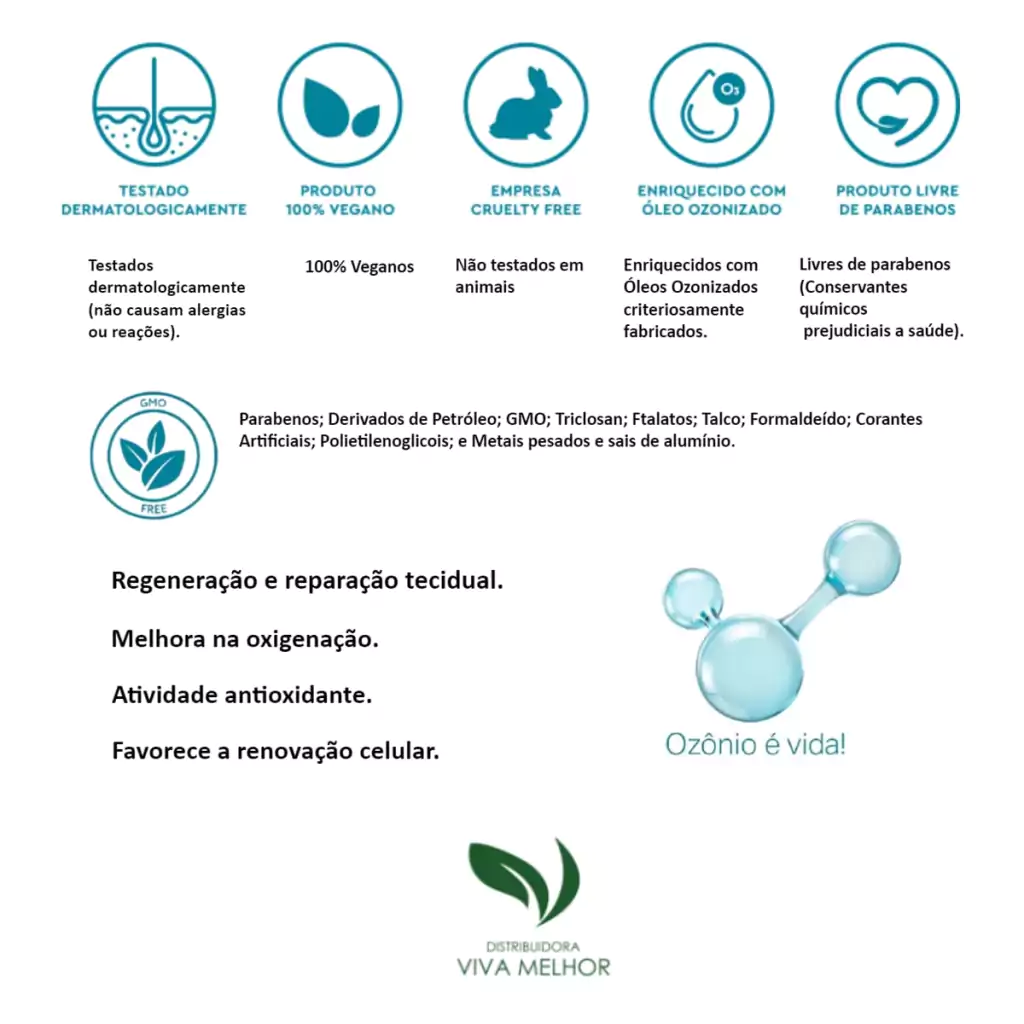 Previne fungos e bactérias através da ação antimicrobiana do óleo ozonizado e do óleo de melaleuca.